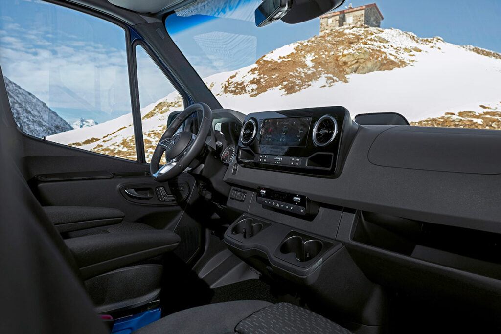 El interior de la Mercedes-Benz Sprinter ha sido diseñado como un espacio de trabajo inteligente. La cabina ofrece una posición de conducción elevada y cómoda, con excelente visibilidad y controles intuitivos. Los materiales transmiten solidez y están preparados para resistir el uso intensivo propio de un vehículo comercial.